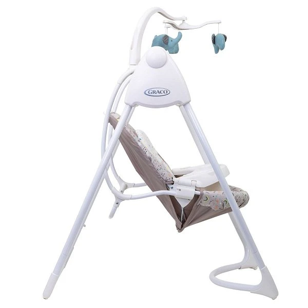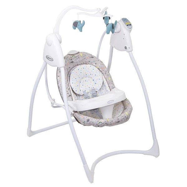 Die Graco Lovin Hug Schaukel verfügt über eine vierfach verstellbare Rückenlehne und dank der abnehmbaren Kopfpolsterung können bereits Neugeborene in den Genuss dieser Babywippe kommen. Die Schaukelbewegung helfen beim Entspannen und die Melodien sowie Naturgeräusche tragen dazu bei. Das angebrachte Mobile bietet Unterhaltung im Babyalltag.