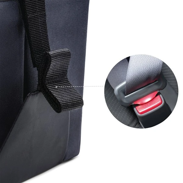 Für einen sicheren Halt auf der Fahrzeug-Rücksitzbank kann der Organizer am Fahrzeuggurt befestigt werden.