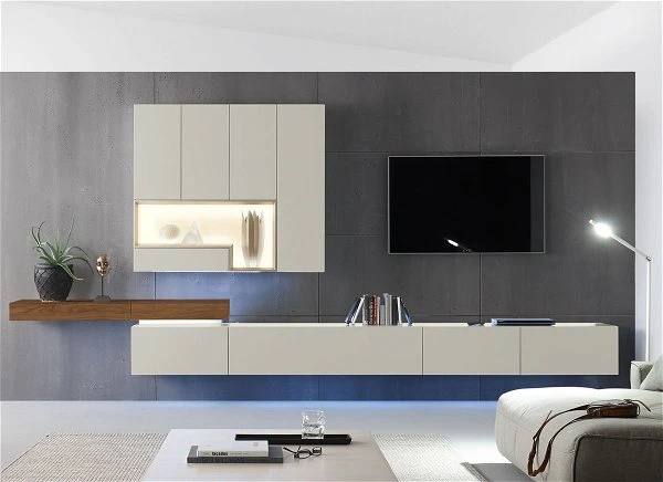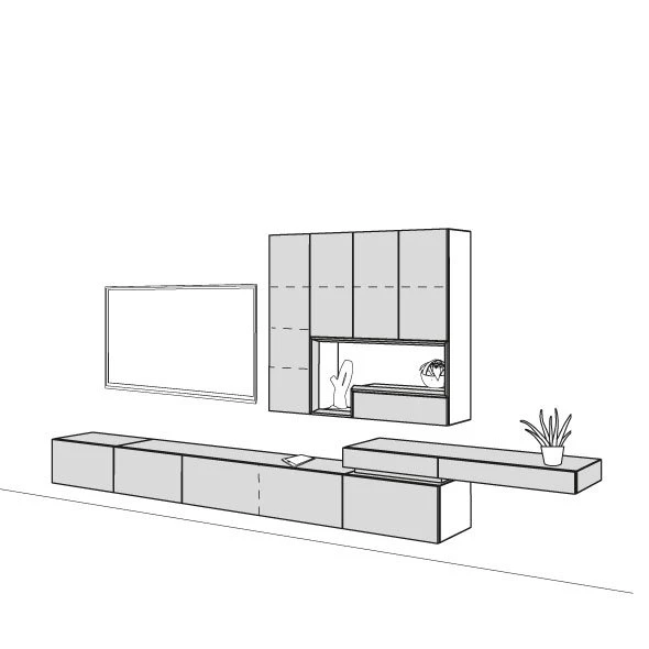 Die hülsta Tetrim Wohnwand 4 besteht aus 2 Lowboards, 1 Schreib-Element und zwei Hängeelementen mit einem offenen Fach.