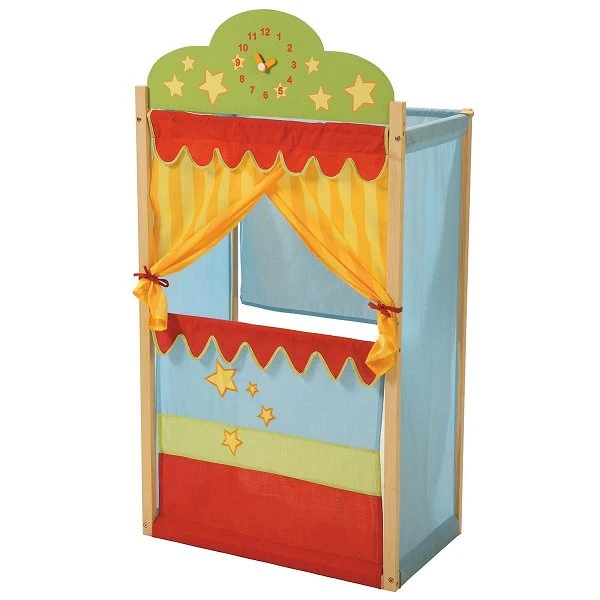Das Roba Kasperletheater kann frei im Raum stehen und begeistert zwei Puppenspieler zugleich. Das Rollenspiel fördert die Kreativität Ihres Kindes und mit aufwändig bestickten und bedruckten Theatersternen bietet es ein farbenfrohes Spielerlebnis. Natürlich darf ein Vorhang bei einem Theater nicht fehlen und eine Uhr zeigt Ihnen wann die Vorstellung beginnt.