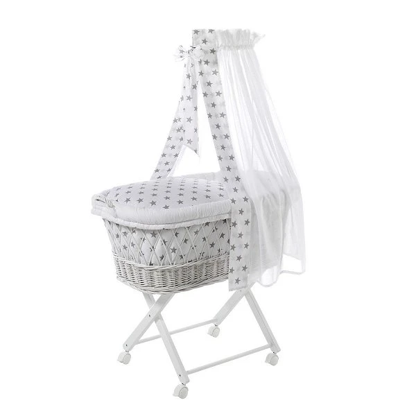 Dieser romantische Stubenwagen von Schardt besitzt einen echten Weidenkorb. Das X- Gestell ist aus massivem Buchenholz gefertigt und weiß lackiert. Der Stubenwagen Babsi ist mit 4 feststellbaren Rollen ausgestattet.
