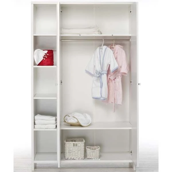 Trendig „natürlich weiß“ präsentiert sich der Kleiderschrank ECO Stripe. Die helle Farbauswahl mit dezenter Streifenfräsung der Möbelfronten (MDF) vermitteln Leichtigkeit und ein liebevoll gestaltetes Kinderzimmer. Besonders auffallend und praktisch ist das Seitenregal am Schrank!