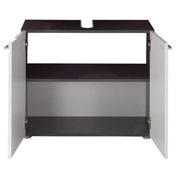 Die trendteam Tetis Badmöbel ist die stylishe Lösung für jedes Badezimmer in dem es noch an Stauraum fehlt. Die eingesetze Dekorfolie verleiht der Oberfläche Langlebigkeit. Das Design kennzeichnet der graphitfarbene Korpus in Kombination mit der weißen Front in dekorativer Hochglanz Tiefzieh Optik. Silberfarbene Griffe mit mattem Finish fügen sich farblich hervorragend in das Dekor ein.