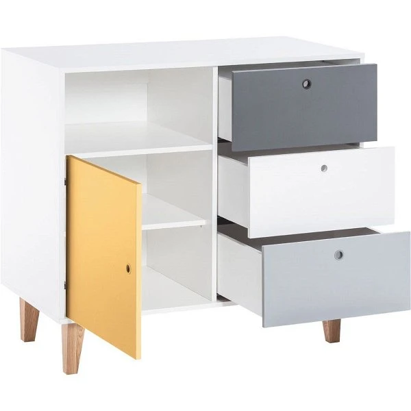 Die VOX Concept Baby Kommode ist mit 4 Schubfächern, sowie einem offenen Fach und einer kleinen Tür ausgestattet und bietet viel Platz für Windeln und Pflegemittel.